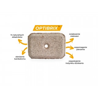 Optibrix™ dzięki swojej strukturze zachęca zwierzęta do dziobania oraz obniża objawy nudy zajmując dużą ilość czasu co bezpośrednio przekłada się na zapobieganie lub zmniejszenie zjawiska kanibalizmu w zagrodzie oraz dziobania piór. Kury zajęte dziobanie naszego dziobaka stają się mniej zestresowane co przekłada się na lepsze wyniki w nieśności oraz przyroście masy ciała w przypadku drobiu rosnącego.